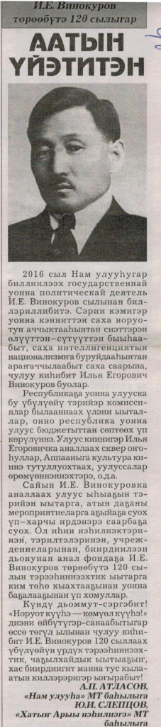 Атласов, А.П. Аатын үйэтитэн / А. П. Атласов // Эҥсиэли. — 2016. — Олунньу 6 к.