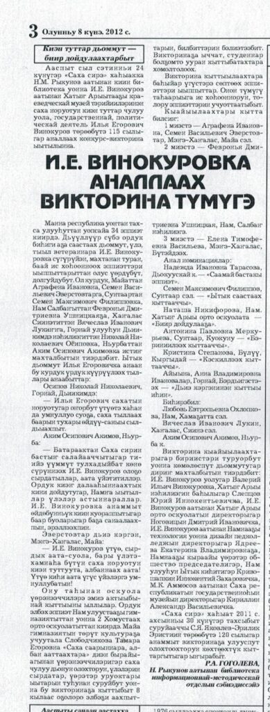 Гоголева, Р. А. И.Е. Винокуровка аналлаах викторина түмүгэ / Р. А. Гоголева // Эҥсиэли. — 2012. — Олунньу 8 к.