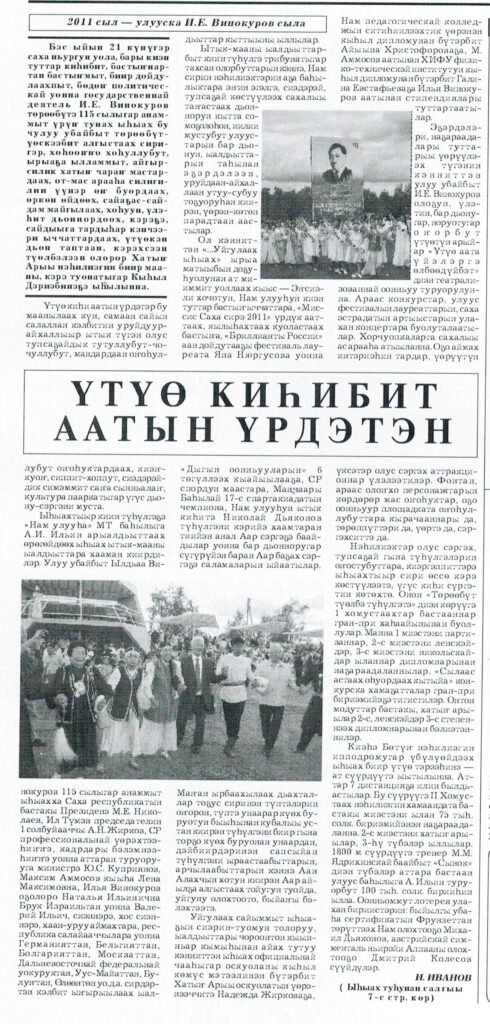 Иванов, И. Үтүө киһибит аатын үрдэтэн / И. Иванов // Эҥсиэли. — 2011. — Бэс ыйын 29 к.