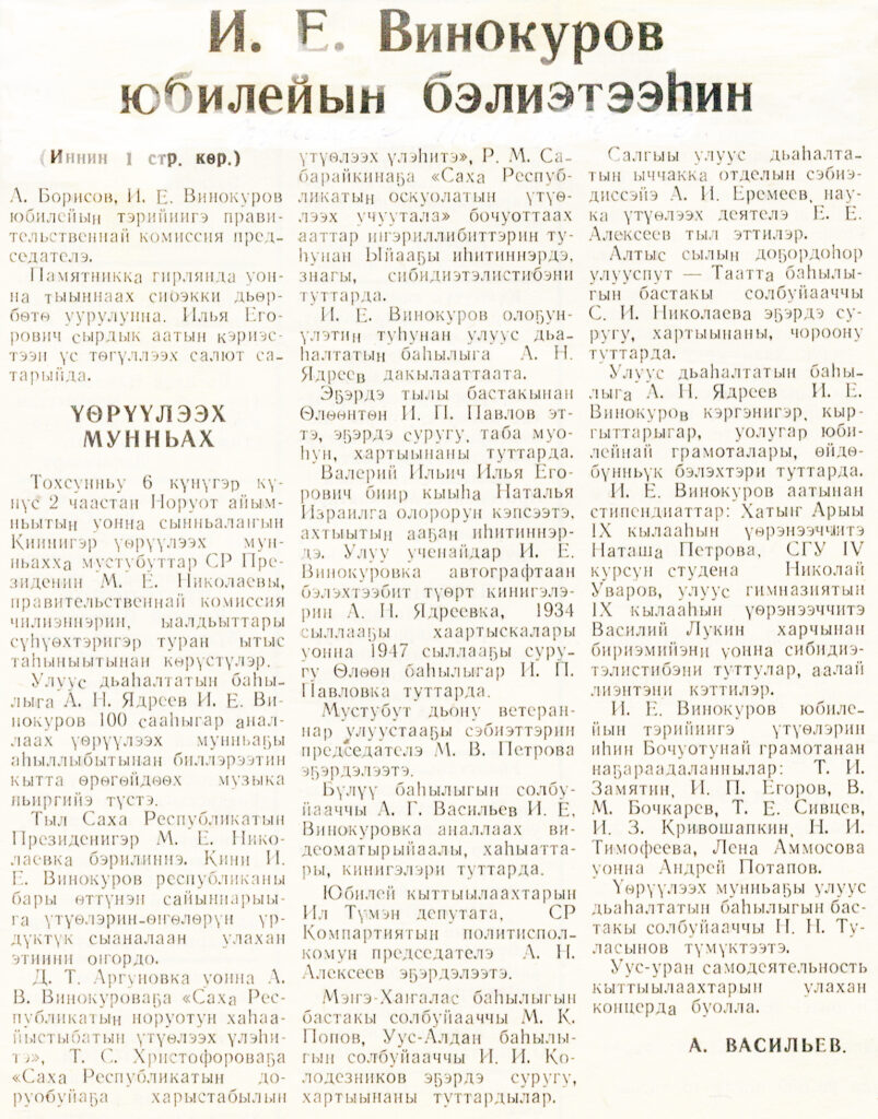 Васильева, А. И.Е.Винокуров юбилейын бэлиэтээһин / А. Васильева // Эҥсиэли. — 1996. — Тохсунньу 11 к., ч2