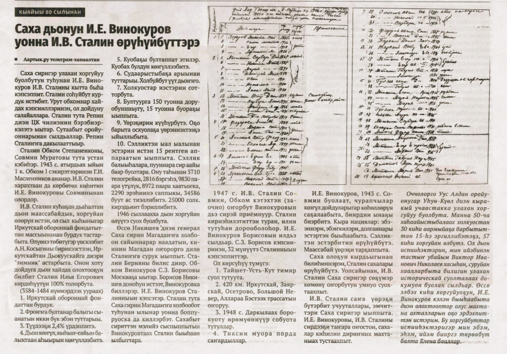 Саха дьонун И. Е. Винокуров уонна И. В. Сталин өрүһүйбүттэрэ // Киин куорат. — 2025. — Алтынньы 2 к. — С. 23.