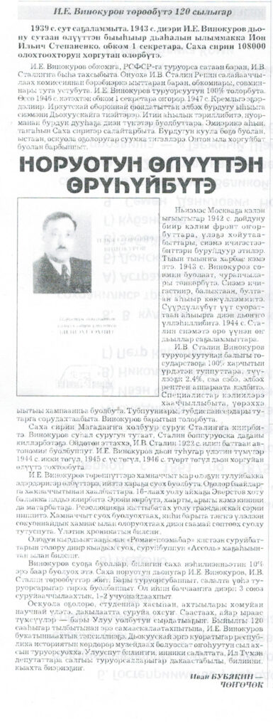 Бубякин-Чөнөчөк, Иван Афанасьевич. Норуотун өлүүттэн өрүһүйбүтэ : [И. Е. Винокуров төрөөбүтэ 120 сылыгар] / Иван Бубякин-Чөнөчөк // Эҥсиэли. — 2016. — Сэтинньи 25 к. — С. 3.