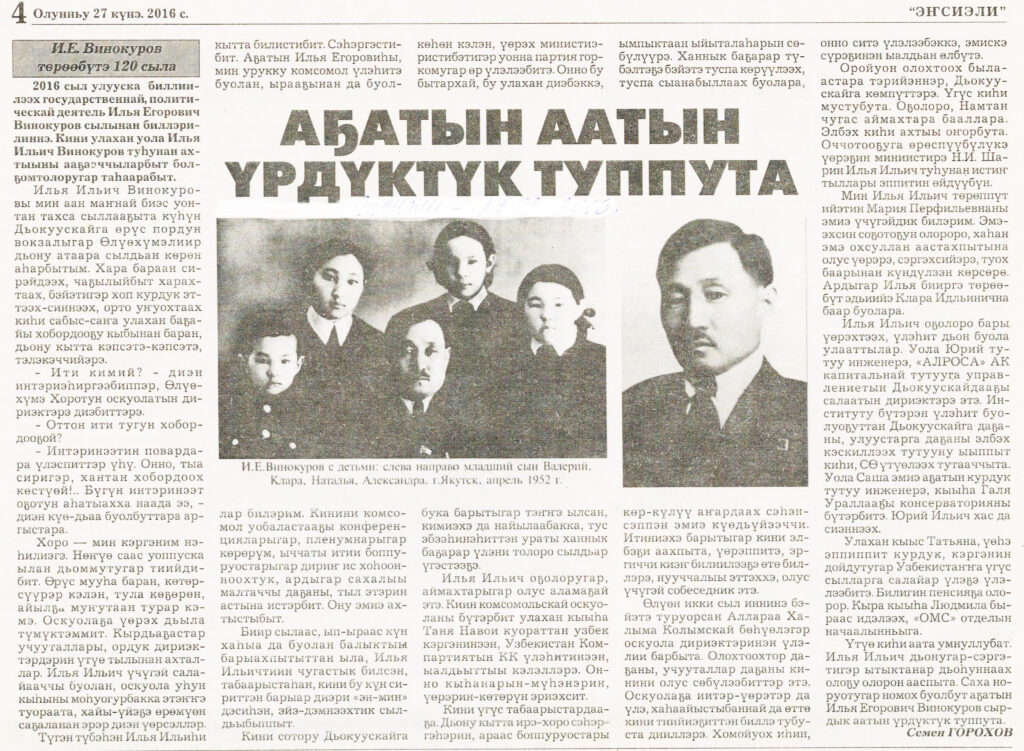 Винокурова,К.И. Аҕам үтүө, чиэһинэй киһи этэ / К. И. Винокурова // Энсиэли. — 2016. — Тохсунньу 16к