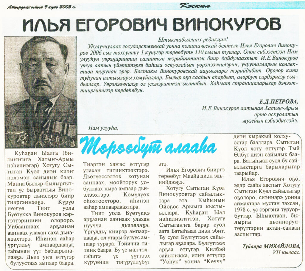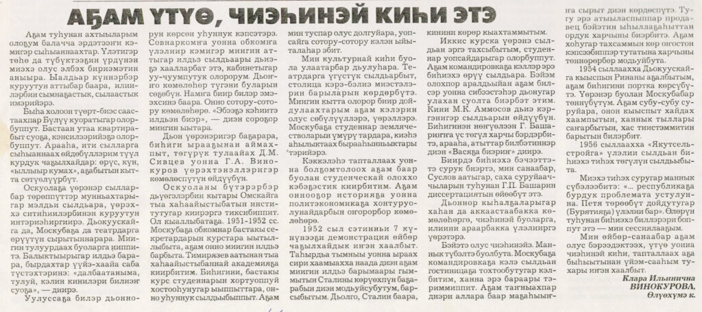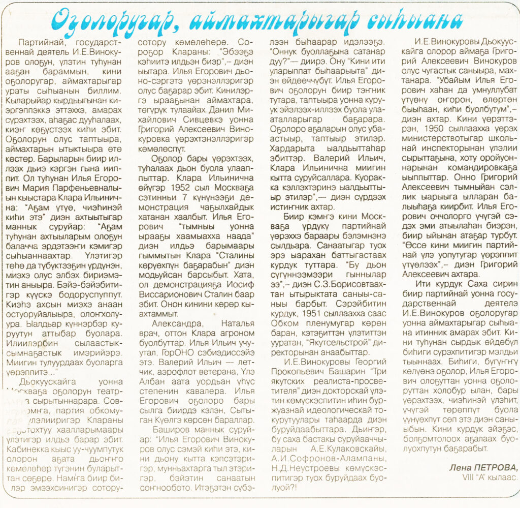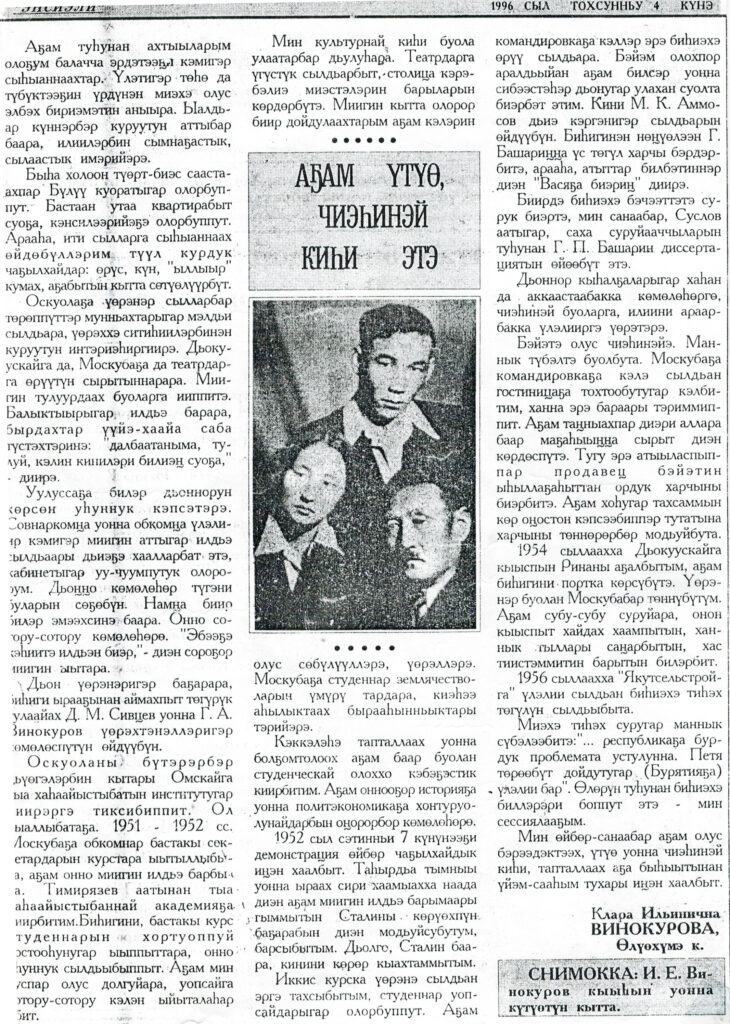 Винокурова, К. И. Аҕам үтүө, чиэһинэй киһи этэ / К. И. Винокурова // Энсиэли. — 1996. — Тохсунньу 4к