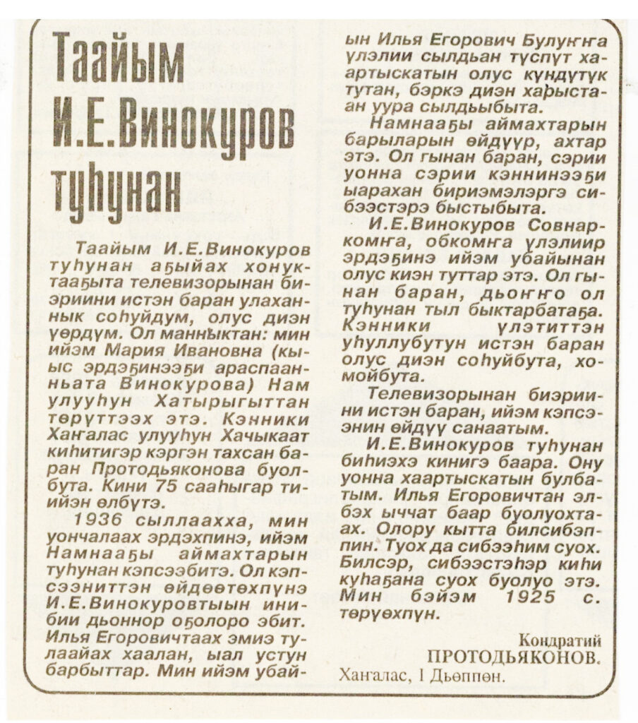 Протодьяконов, К. Таайым И. Е. Винокуров туһунан / К. Протодьяконов // Саха сирэ. — 1996. — Тохсунньу 10к.