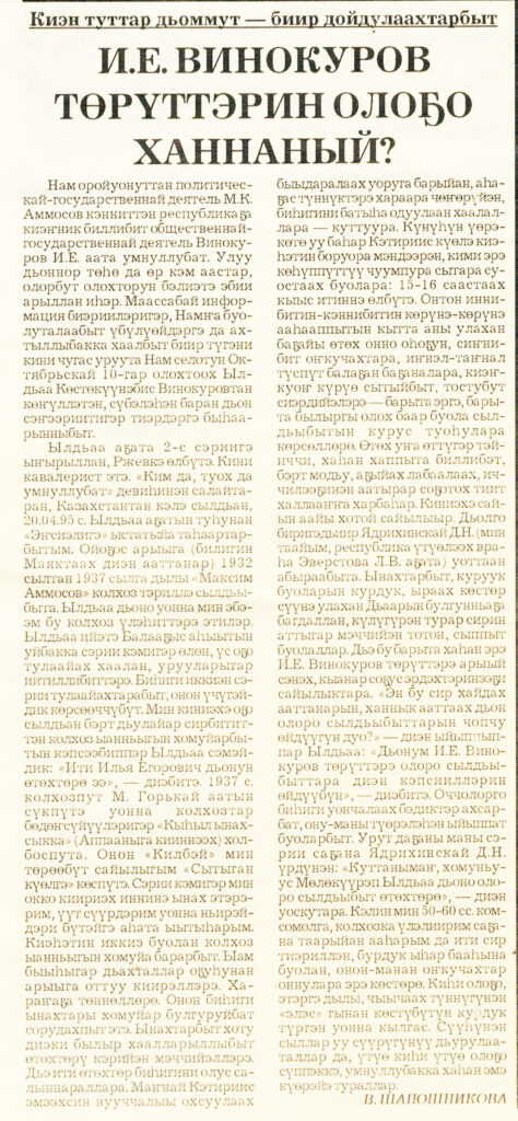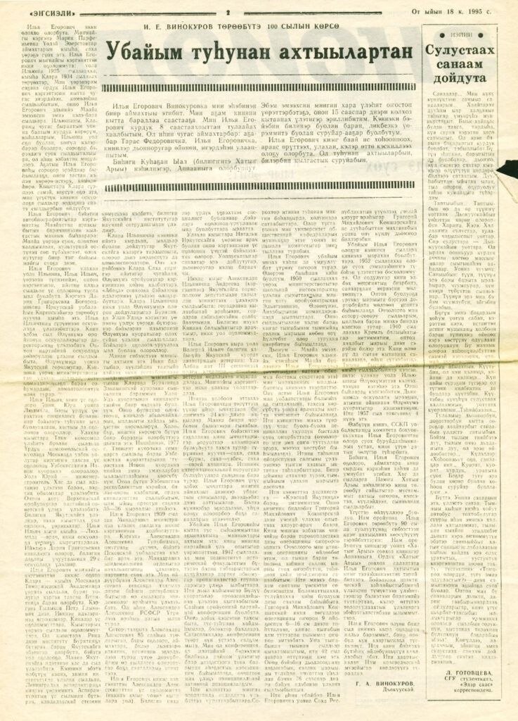 Винокуров, Г. А. Убайым туһунан ахтыылар / Г. А. Винокуров // Энсиэли. — 1995. — От ыйын 18к