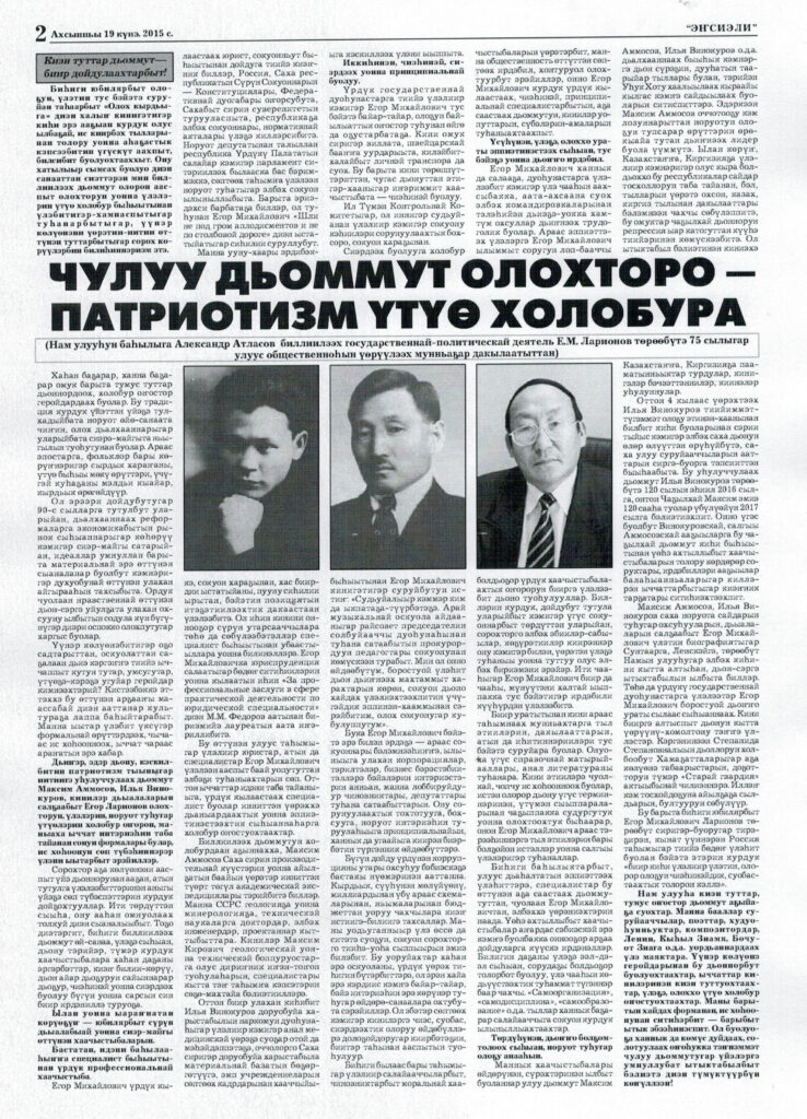 Чулуу дьоммут олохторо — патриотизм үтүө холобура // Энсиэли. — 2015. — Ахсынньы 19к.