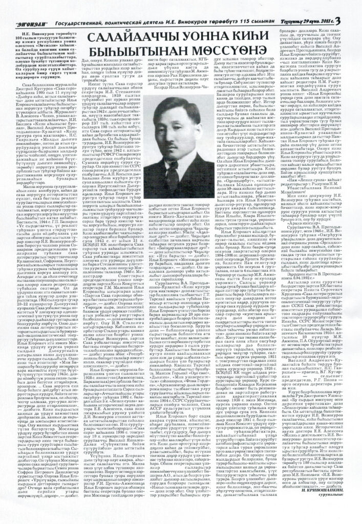 Кривошапкин,И. Салайааччы уонна киьһи быһыытынан мөссүөнэ / И. Кривошапкин // Энсиэли. — 2011. — Тохсунньу 29к.