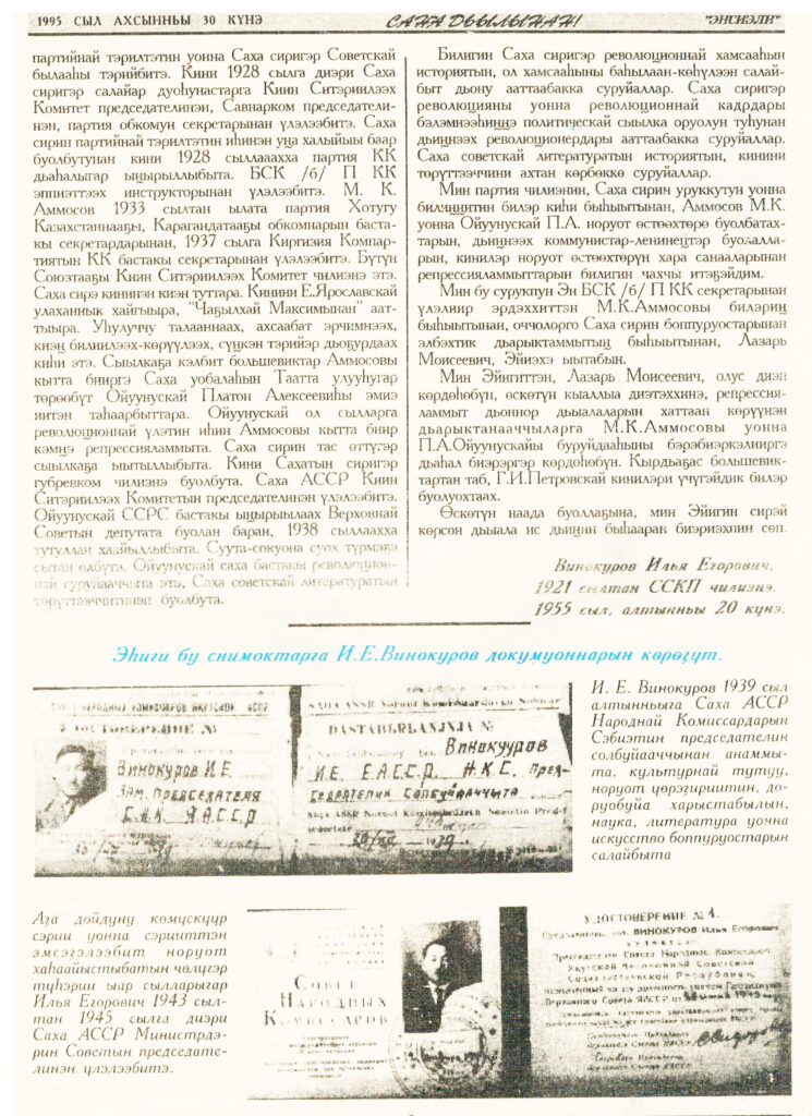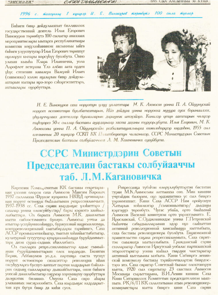 Винокуров, И. Е. ССРС Мин. Сов. председателин бастакы солбуйааччы таб. Л. М. Кагановичка / И.Е.Винокуров // Энсиэли. — 1995. — Ахсынньы 30к ч1